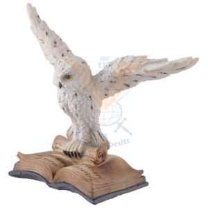 Statuette representing a snowy owl with outstretched wings, holding a scroll in its claws resting on an open book.