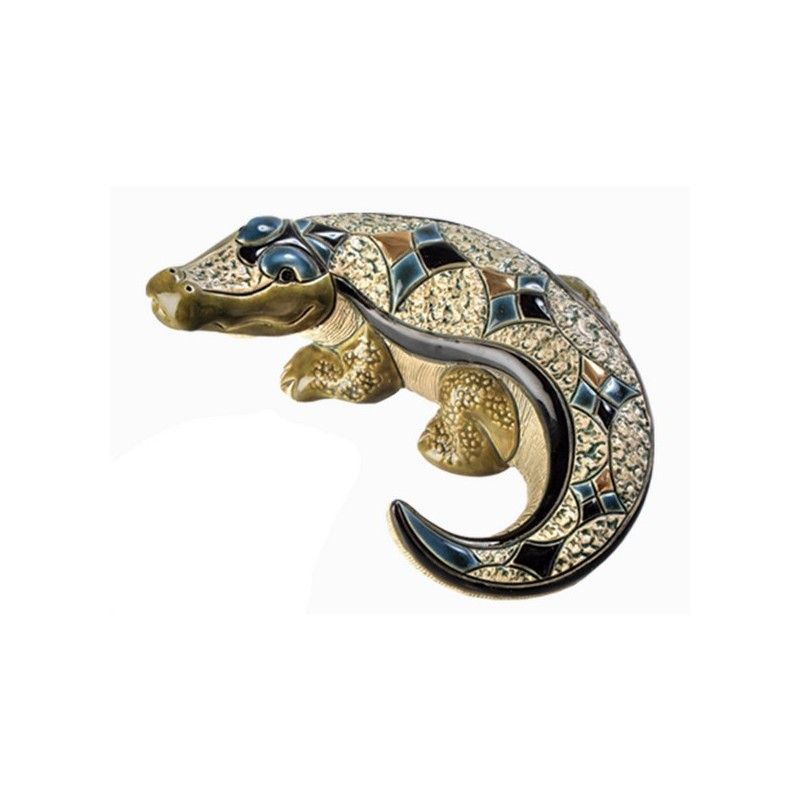 This crocodile is hand-painted with a colorful variety of ceramic slips and bright enamel glazes, then accented with platinum and 18 karat gold.