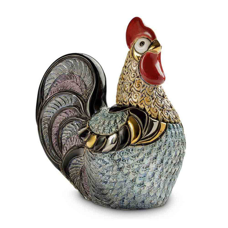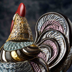 This beautiful rooster is hand-painted with a colorful variety of ceramic slips and bright enamel glazes, then accented with platinum and 18 karat gold.