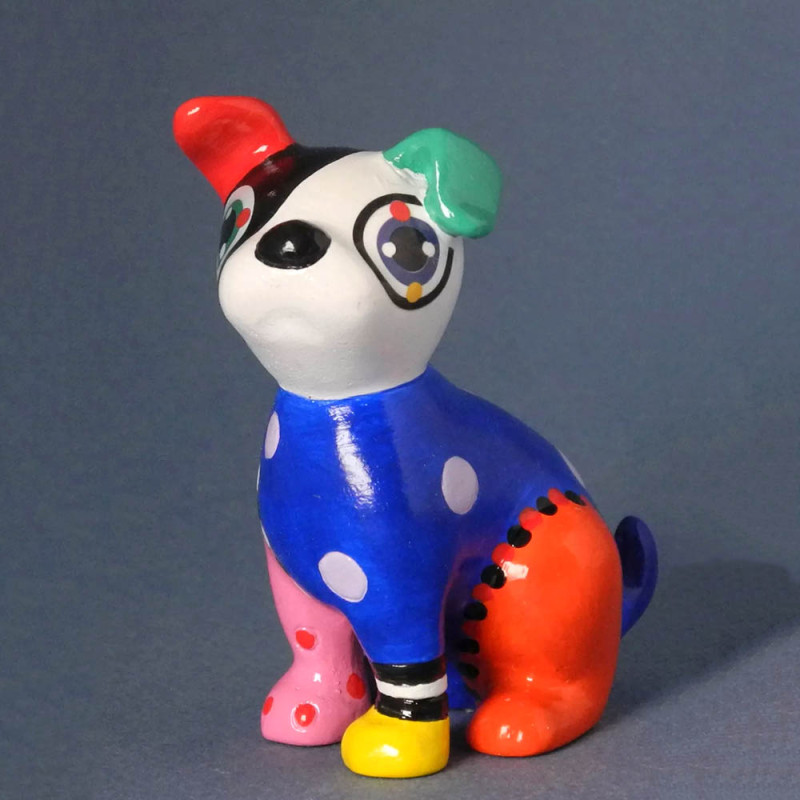 She mainly creates abstract paintings and original sculptures. Her art clearly shows her fascination for animals such as dogs, cats and giraffes, with a clear preference for bright colors. Her work highlights unusual colors and shapes that she observes in certain plant and animal species in nature from which she draws her inspiration. From the beginning, she wanted her art to be colorful and joyful. Her creations are invitations to stop and enjoy the moment, to smile at the happy moments.