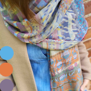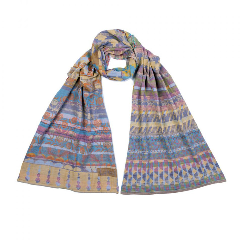 This pretty scarf, woven on a loom in Charlieu (a small town in the northern Loire region of France), combines several geometric patterns. It is made from organic cotton.