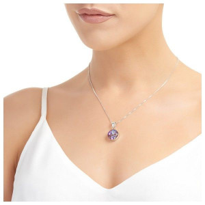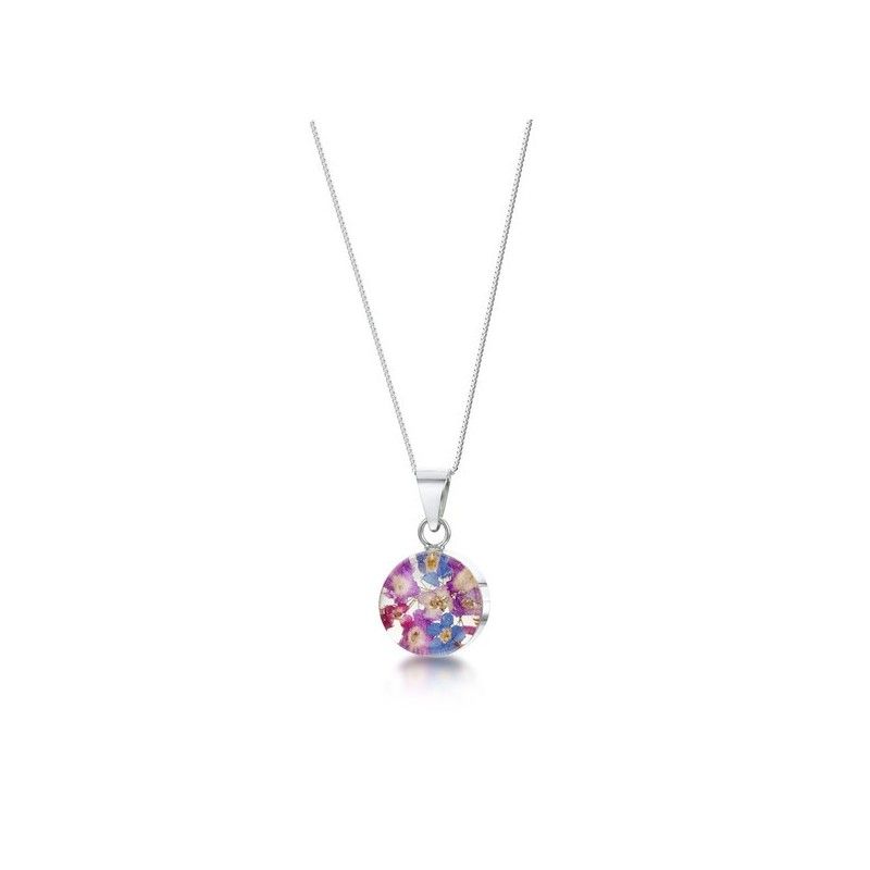This jewel is a simple round pendant made with real forget-me-nots & purple verbenas.