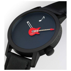 This watch with black strap and dial, contrasted with a red electric guitar, will charm all guitarists and music lovers.