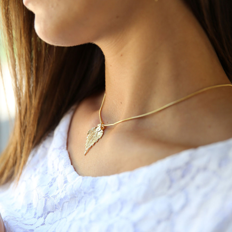 Nature offers this leaf of great finesse, soaked in two layers of copper and then dipped into a fine gold or rhodium silver bath. A adjustable chain is offered with each pendant.