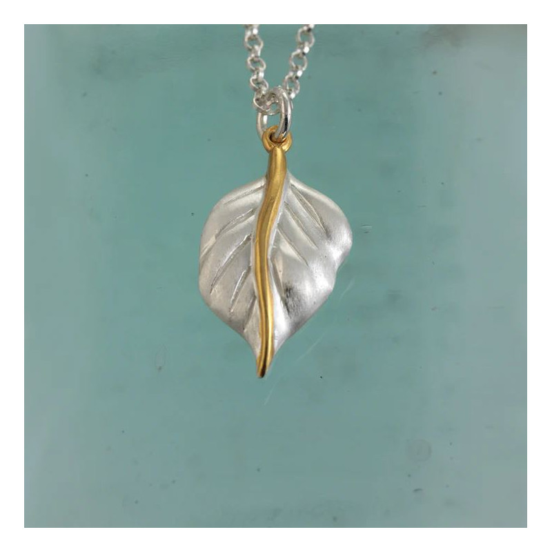 A simple silver leaf with a luxurious satin finish and 18ct. gold plated details. This lovely piece comes on an 18 inch silver chain in a pretty gift box making an ideal gift.
