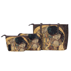 Vintage high quality tapestry bag representing the famous work The Kiss by Gustav Klimt. The particularity of this fabric is that the patterns are not printed, but woven, adding extra charm to this bag. Spacious tote bag for everyday use with zipper and interior compartments for cell phone and coins.