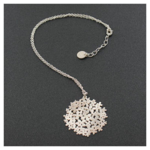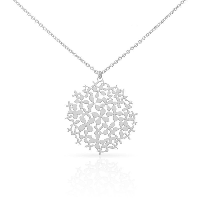 Silver colored necklace. This minimalist style jewel is inspired by Sorolla's Hydrangea Garden which is an oil on canvas by the Spanish painter Joaquín Sorolla. The hydrangea flower is said to symbolize beauty and grace.