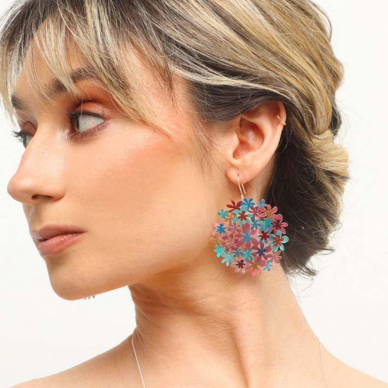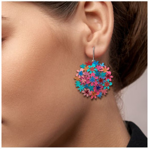 Earrings in the shape of a bouquet of flowers. They are inspired by flowers taken from the forest, with a color palette oriented towards turquoise and pinks.
