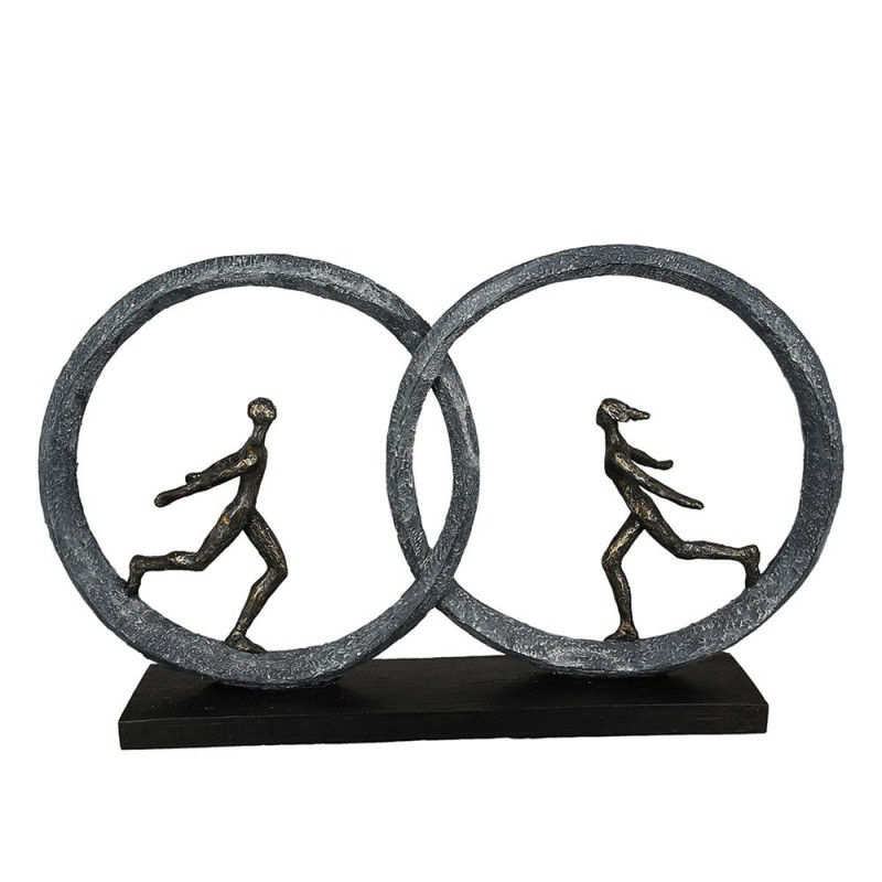 A sculpture carrying a strong symbol: the love that unites two people. The intertwined circles in which the characters find themselves can evoke wedding rings, or even the cycle of two lives which unite. The patinated bronze appearance combined with clean lines gives it elegance and contemporary style.