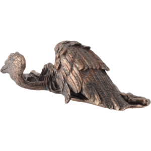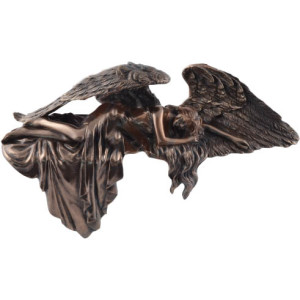 This patinated bronze sculpture represents a guardian angel. It should be placed on the edge of a shelf.