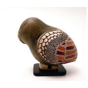 This creation represents an oil or perfume flask in the Orientalised, Late Proto-Corinthian style (650-625 B.C.). A string can be run through the hole enabling the flask to be hung up.
