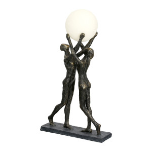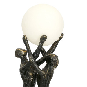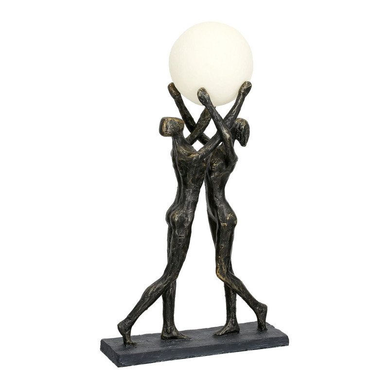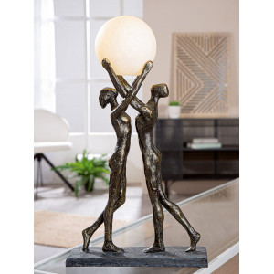 Original lamp representing two characters holding a moon, made of marble powder with a bronze patina.