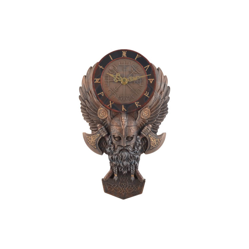 Wall clock made up of 2 axes with the face of a viking looking to the side. It is made with bronze pigments.