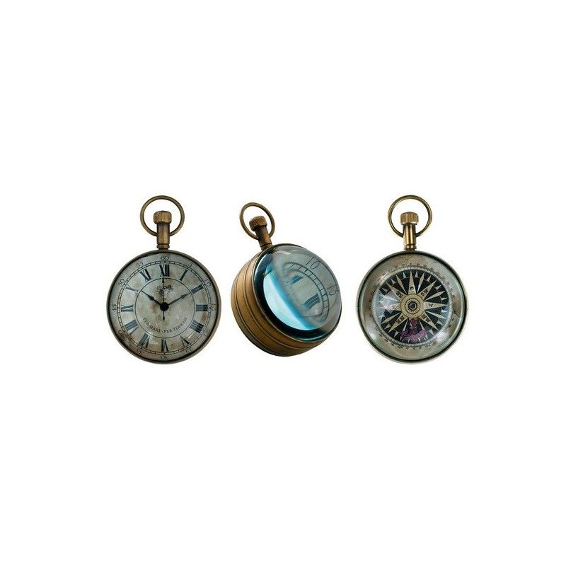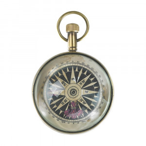 Victorian engineers loved to tinker with design, and make things look interesting and especially larger than life. A pocket watch transformed into a desk watch, convex optical glass magnifiers showing an enlarged dial and hands. Not exactly a travel watch this, more desk bound, an object that delights with its translation of form. Turning into a gem under soft lamp light, it doesn’t easily get lost while always telling time. Aged dial in front, antique compass rose card in back.