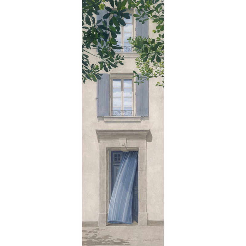 An half open door let the wind play with a blue curtain. The blue color is dominant in this painting as the door and the shutters are also painted in grey-blue, and the blue sky is moving in the windows.