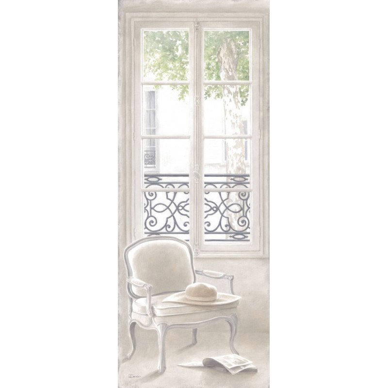 The presence of a character is suggested but does not appear directly. A hat, an armchair and a magazine in front of a French window... The place is peaceful like in all Chevalier's works but for the first time takes place in a city according to the facade which we perceive on the other side of the street. The perspective is very deep and this is the signature of the artist.