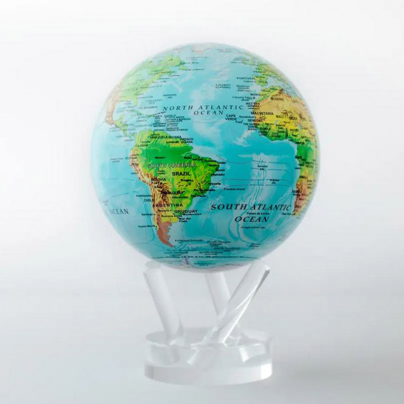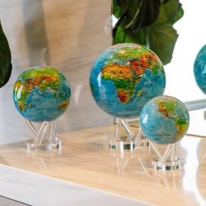 The classic Blue with Relief Map Mova globe details the unique features of our planet Earth to provide both compelling knowledge and compelling design. A palette of dark green and brown colors highlights the diverse landscapes covering Earth’s landmasses while a gradient of blue shades and directional arrows indicates changes in elevation and the flow of ocean currents.