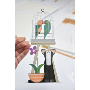 This pretty frame full of colors will show you the encounter of a curious cat with his two volatile friends.