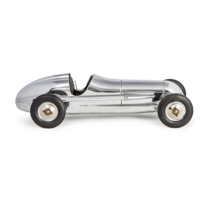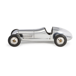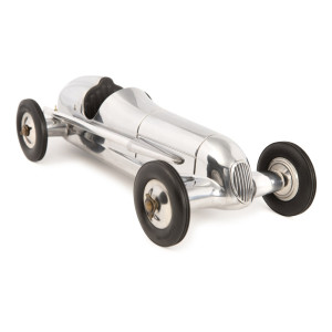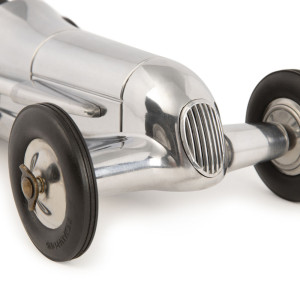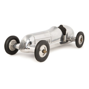 Its original makers were the famous Dooling Brothers, who manufactured around 1000 units at the time. They were offered to aficionados of the famous Dooling spin-dizzies, miniature motorized racecars that reached dizzying speeds. They were closely modeled on the famous Mercedes Silver Arrows of the early 1930s. Originals are now rare and highly prized by collectors. Molded with the same exacting detail as its original, our 12.2″ Indy racer is hand-cast in airplane aluminum. In keeping with its original model-toy character, the front wheels are not linked to the steering wheel. The wheel hubs and rubber tires are made with the same exact detail as the original. This shiny, sleek desktop racer represents both the romance and the dramatic beauty of the most famous Grand Prix racers ever!