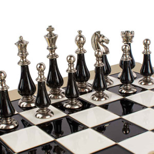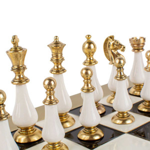 This complete set features handcrafted chess pieces made of genuine mother of pearl and metal with a gold and silver finish. They pay homage to the timeless design of Staunton. The black and white board with gold edges is beautifully finished, with detailed feet and a very elegant lacquered appearance. This chess board comes in its original box with a beautiful laminated wooden case. Indulge in the timeless elegance of the classic handcrafted Staunton chess set. This set will become a centerpiece in any games room. The King is 10 cm high. Wooden board covered with a hand painted brass leaf. Chess pieces in gold/silver finish metal with mother of pearl elements. Details below.