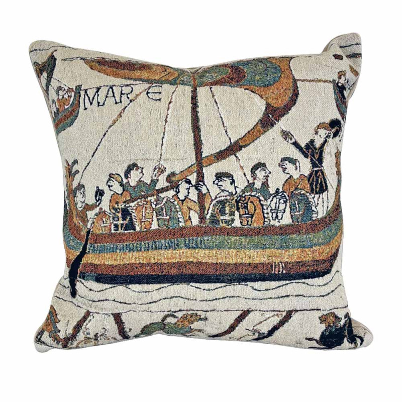 This woven cushion cover depicts the scene where William the Conqueror crosses the sea on a large ship, from the Bayeux Tapestry (11th century).