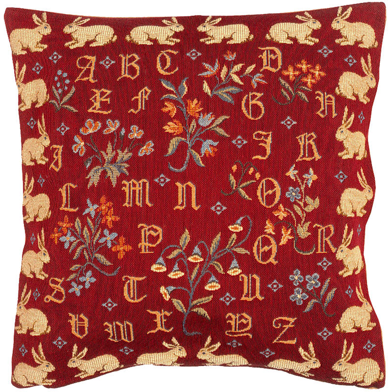 This woven cushion cover, like all the famous “Mille Fleurs” tapestries of the Loire valley, depicts scenes from life in the Middle-Ages. Rabbits inhabit a lush garden. This style is representative of the Art Tapestry during the 15th and 16th centuries.