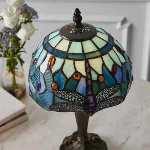 This Dragonfly Blue mini lamp is part of traditional Tiffany Art Nouveau style. This design in a vivid blues with multi coloured glass beading creates a beautiful atmosphere, suitable for any interior.