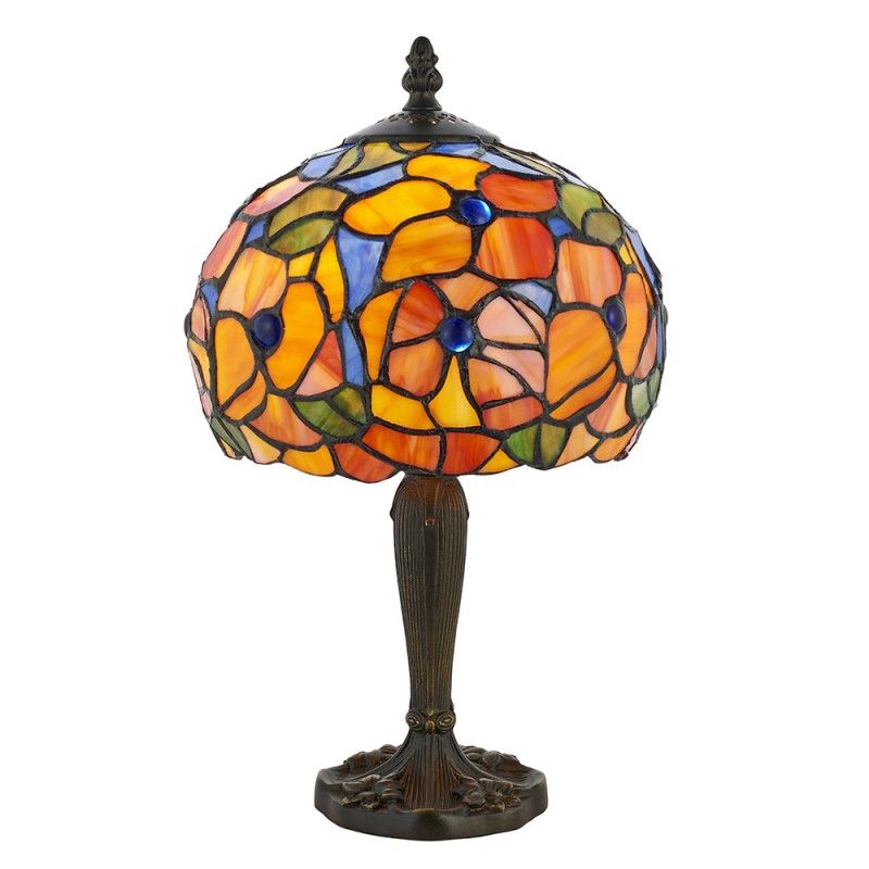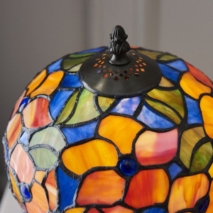 This small lamp is decorated with Art Nouveau elements, such as floral theme. Its design is redolent of Traditional Tiffany Styles.