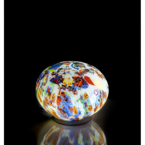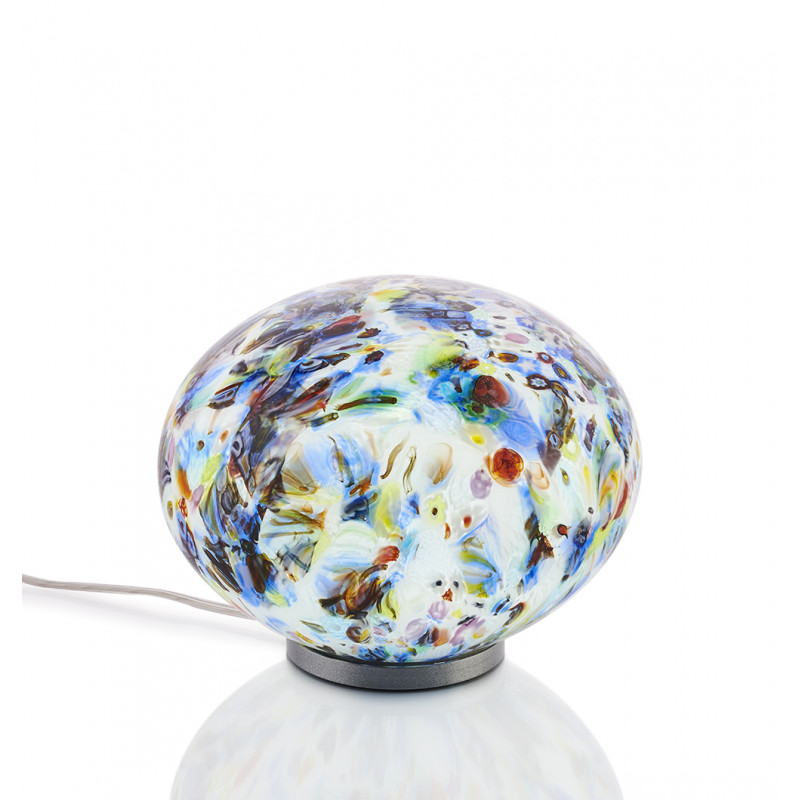 The SUN blown glass lamp is characterized by the insertion of murrines (ancestral technique of Murano glasswork). Multicolored glass rods with a wide variety of patterns are made and then cut into thin discs. These discs are laid out flat in a mosaic fashion and are then heated in order to be melted into the mass.