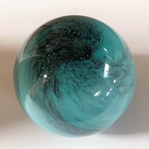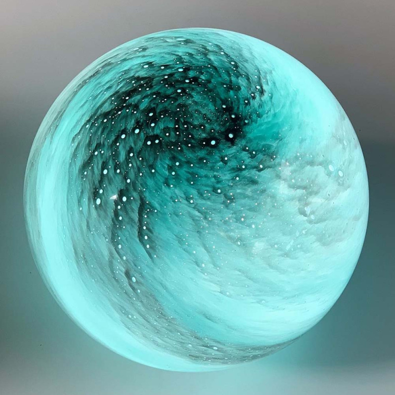 Mouth-blown glass lamp, round in shape, named "Planet", in blue tones.