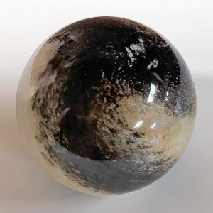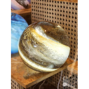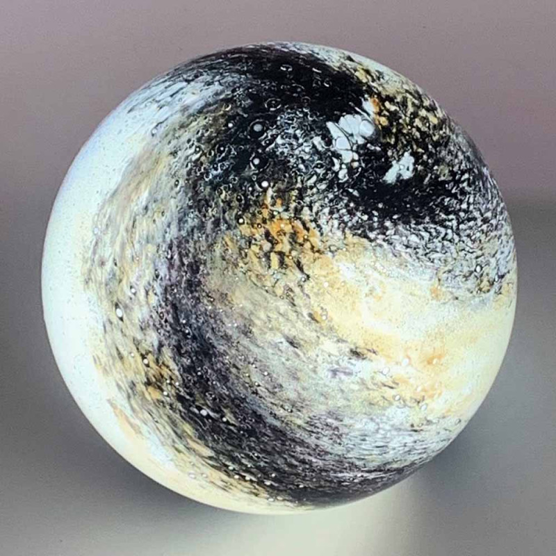 Mouth-blown glass lamp, round in shape, named "Planet", in beige/black tones.