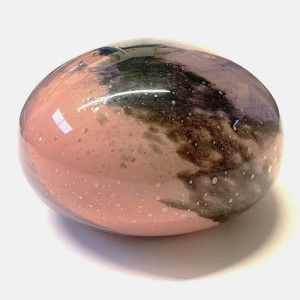 Mouth-blown glass lamp, oval in shape, named "Planet", in pink / purple tones.