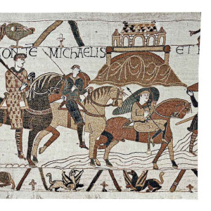This wall tapestry depicts the scene where William the Conqueror and his army arrive at Mont-Saint-Michel, from the Bayeux Tapestry (11th century).