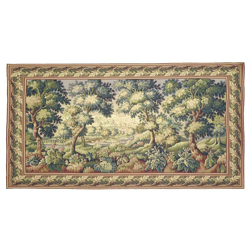 This tapestry depicts grennery. Influenced by the medieval « Millefleur » and the 16th century « aristolochia » or « cabbage leaves », the « verdure » tapestries appear in Flanders, Brussels and Audenarde in the early 17th century. « Verdure » tapestries could be compared to landscape-painting, no characters, no religious or mythological scenes, only nature and occasionally a few animals or buildings inthe background.