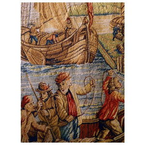 This tapestry is inspired by an original design of David Teniers II (1610-1690) made in Brussels in 1651 in the Jérôme Le Clerc’s and Jacques Van der Borcht’s workshops. This tapestry was woven in 1750 in the Van den Hecke’s workshops. A popular subject for the weavers, fishing and trading being the main activity of the northern ports, this scene captures the strength and vigour of these marine themes.