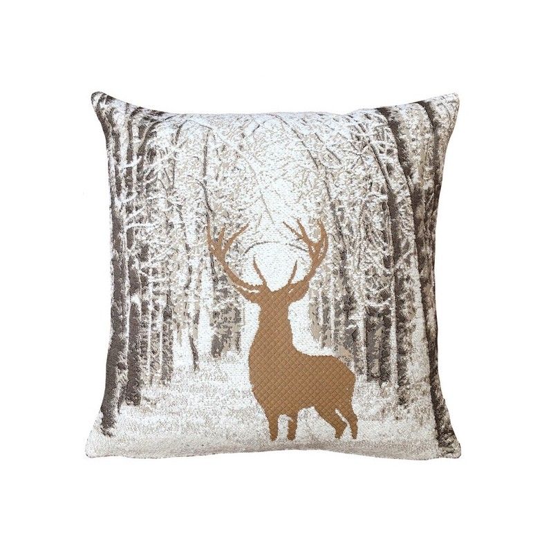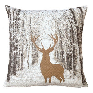 Stylized deer cushion. The treatment of the design and its colors combine tradition and modernity. Ideal to bring a nature and cocooning spirit to your interior. Soft materials and weaving effects give it relief.