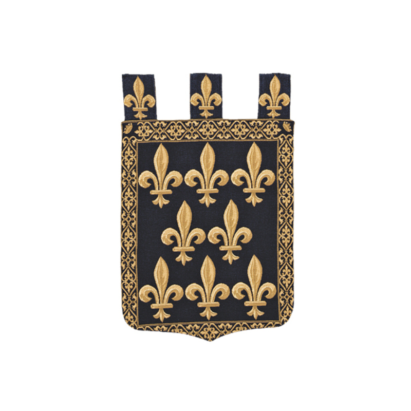 This woven banner represents fleurs de lys, the symbol of French Kingdom.