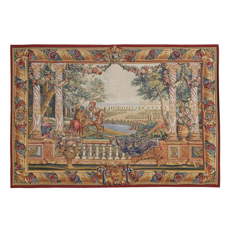 This tapestry is based on the famous set of twelve tapestries “Les Maisons royales” designed by Charles Le Brun (1619-1690) and woven from 1668 to 1711 by the Royal Manufacture of Gobelins. Allotted to the decoration of royal houses or used as diplomatic presents, all those tapestries were created to the glory of the king of France Louis XIV (1638-1715). They feature, in the foreground, the sovereign himself and evoke his castles, his entertainments and the pomp of the court. This tapestry pictures Louis XIV hunting in the grounds of the Versailles castle.