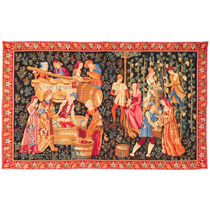 This tapestry is based on a high-warp French tapestry from the 15th century. Museum of Cluny. In the Middle-Ages, tapestries were almost exclusively intended for the lords, yet they sometimes pictured scenes from everyday life. The artist has set the tapestry against a flowerdotted background and exalts the work on the vine. While the workers are busy around the vines, the elegant people enjoy tasting the juice of the first grapes.