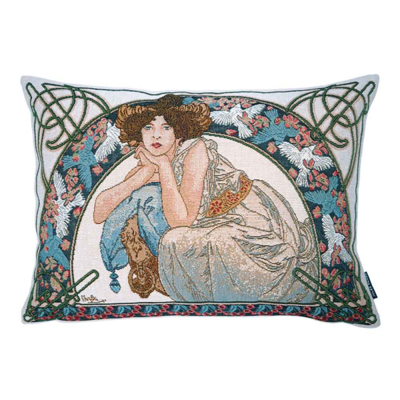 Cushion cover woven on a jacquard loom representing a work by Alfons Mucha, a major artist of the Art Nouveau style.