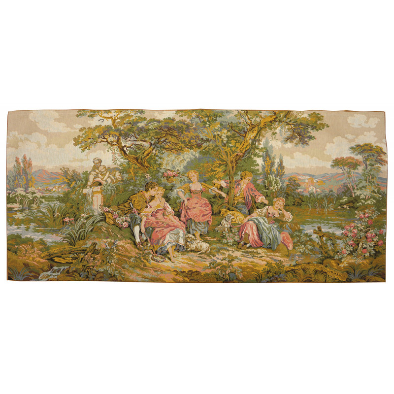This tapestry is based on F. Boucher's work (1703-1770). Boucher had been the superintendent of the Manufacture of Gobelins since 1755. His cartoons were extremely popular. Boucher’s paintings are a faithful reflection of a gentle and refined time, entirely dedicated to love, libertinage and festivities. For him, nature is only a pretext for graceful compositions in which shepherds and shepherdesses indulge in love, flowers and music.