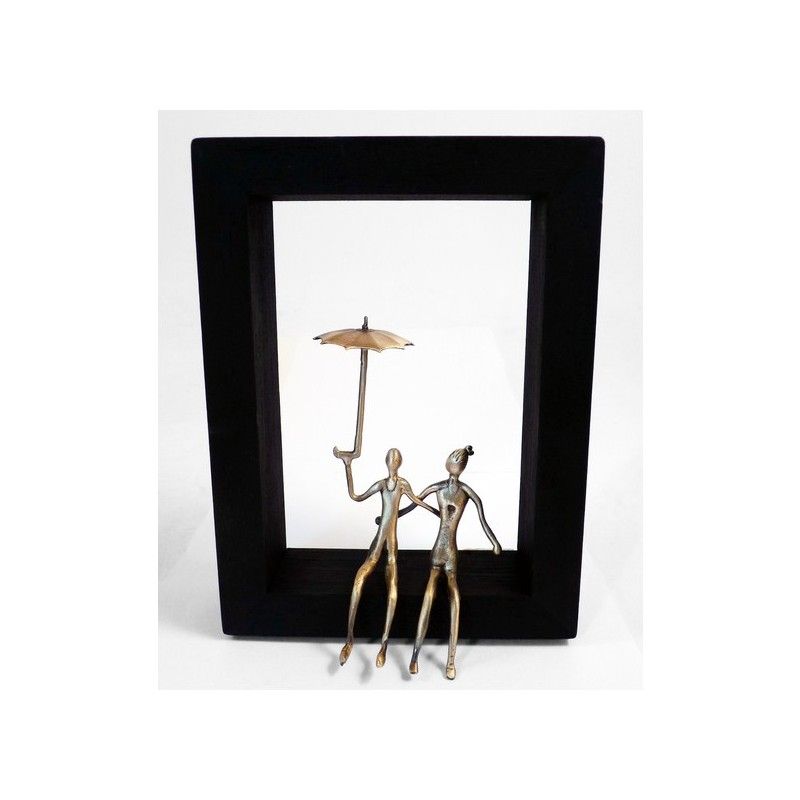 This bronze sculpture framed with wood is a unique and original creation of the Greek artist Georges Roumanas. It represents a couple taking a break under an umbrella.