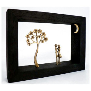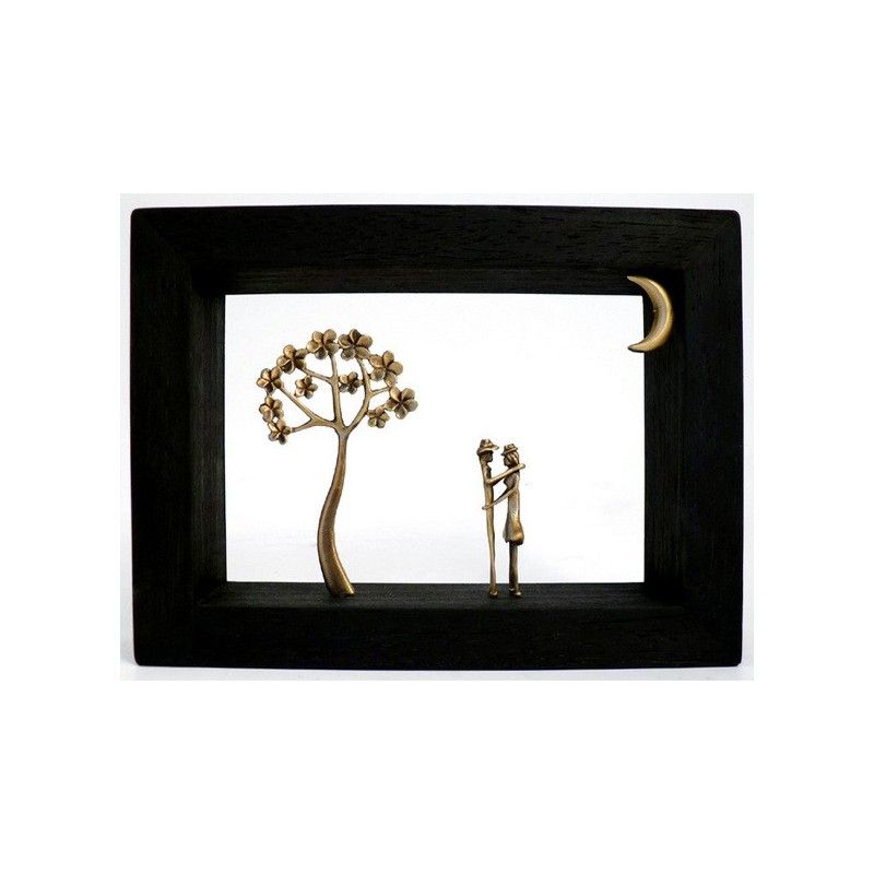 This bronze sculpture framed with wood is a unique and original creation of the Greek artist Georges Roumanas. It represents a couple kissing under the moonlight.