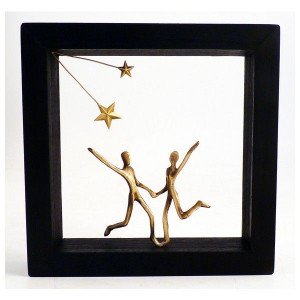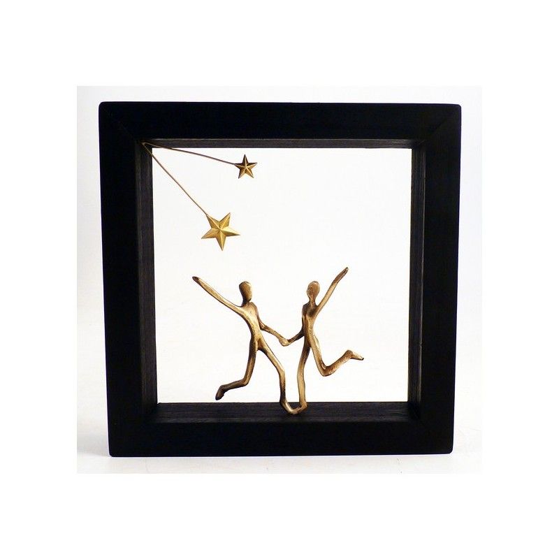 This bronze sculpture framed with wood is a unique and original creation of the Greek artist Georges Roumanas. It represents a pair of dancers under 2 stars.