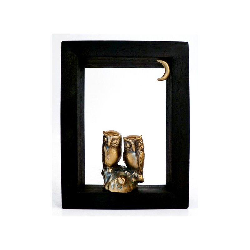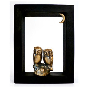 This bronze sculpture framed with wood is a unique and original creation of the Greek artist Georges Roumanas. It represents two owls on a tree, under the moon.