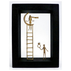 This bronze sculpture framed with wood is a unique and original creation of the Greek artist Georges Roumanas. It represents a man offering a ring to a woman sitting on the moon.