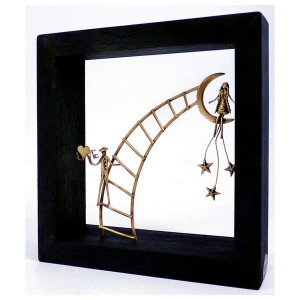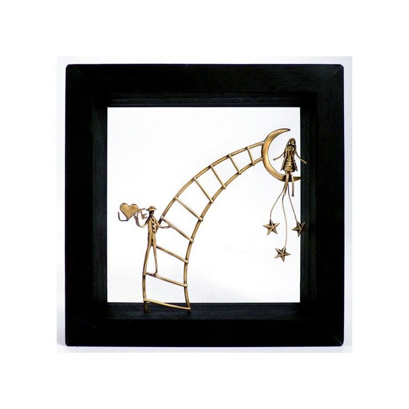 This bronze sculpture framed with wood is a unique and original creation of the Greek artist Georges Roumanas. It represents a man on a ladder, going to the moon where a woman is sitting, a heart in its hand.
