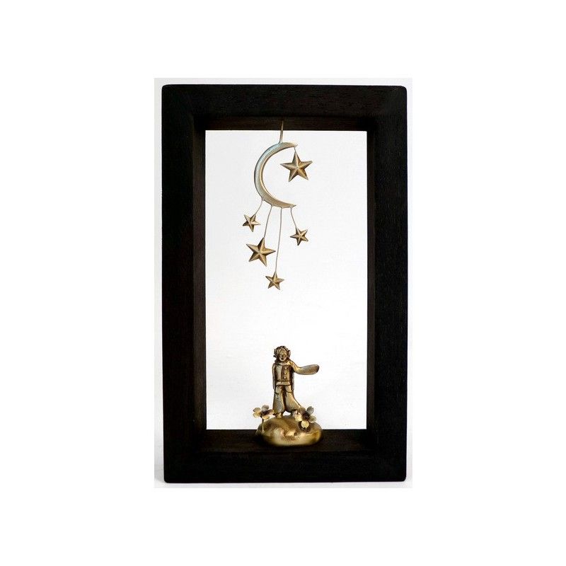 This bronze sculpture framed with wood is a unique and original creation of the Greek artist Georges Roumanas. It represents the famous heroe of Saint-Exupéry's book: The Little Prince.