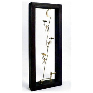 This bronze sculpture framed with wood is a unique and original creation of the Greek artist Georges Roumanas. It represents a few people holding a rope going from the earth to the moon.