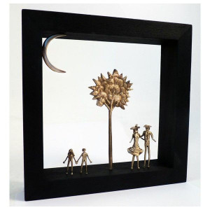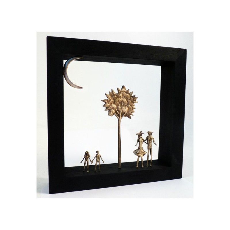 This bronze sculpture framed with wood is a unique and original creation of the Greek artist Georges Roumanas. It represents a family, who seems very strong and peaceful.